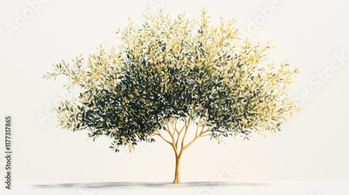 © KYR, Obraz premium A modern tree illustration with golden branches and lush green foliage, set on a clean white canvas.