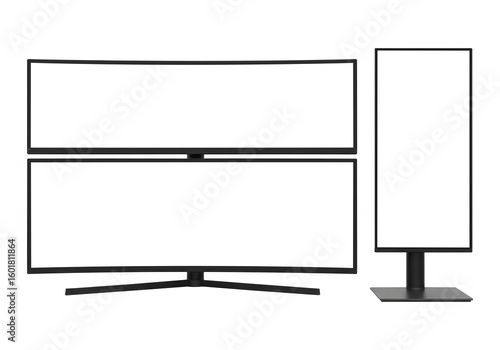 Naklejka premium A Modern Triple Monitor Workstation with Stacked and Vertical Screens, Cut Out, Clipping Path Isolated on a Transparent PNG Background.