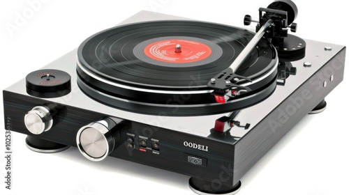 Fototapeta premium A modern turntable with a vinyl record, designed for playing music.
