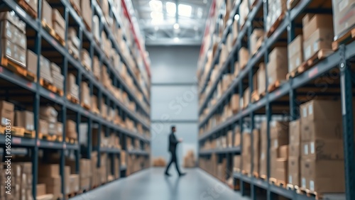 Obraz premium A modern warehouse interior with organized shelves and a worker silhouette in...