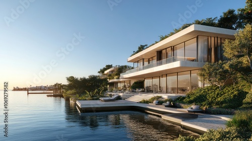 © ROY, Obraz premium A modern waterfront house with a large deck and pool.