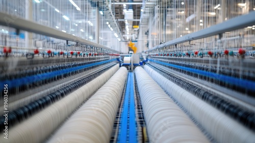 © Sampao, Fototapeta premium A modern weaving machine producing synthetic fiber textiles.