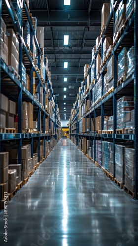 Fototapeta premium A modern, well-organized warehouse with tall shelves filled with boxes and...