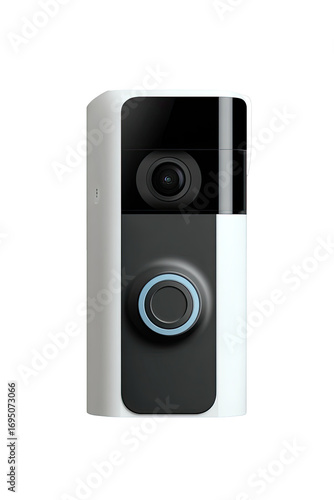 © Daru, Fototapeta premium A modern white and black video doorbell. It features a rectangular shape with a rounded top and bottom. A lens and a push button are visible. A light blue ring surrounds the button