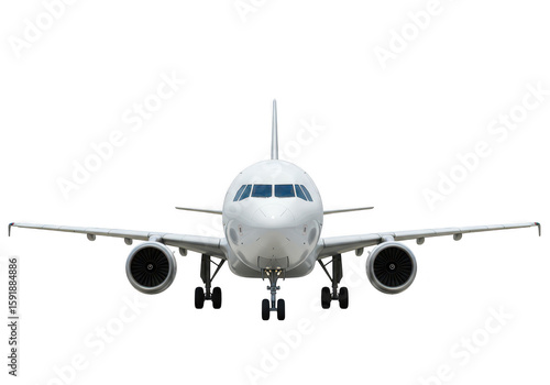 Obraz premium A modern white commercial airplane is viewed from the front, ready for flight, isolated on a transparent background