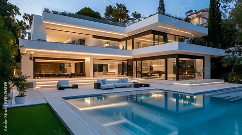 © Tcukimay, Fototapeta premium A modern, white house with a swimming pool and a green lawn. The house is illuminated with warm light, and the pool reflects the sky and the surrounding trees.