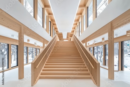 Obraz premium A modern wooden staircase illuminated by large windows, showcasing...