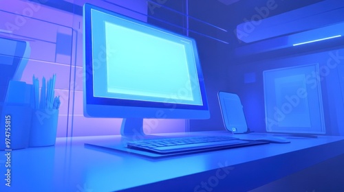 Fototapeta premium A modern workspace featuring a computer and tablet with a futuristic design.
