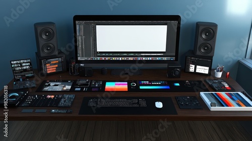 Obraz premium A modern workspace featuring a computer, audio equipment, and design tools...