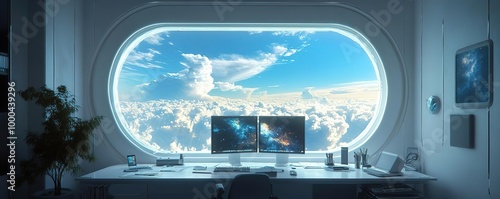 © thanawat, Obraz premium A modern workspace featuring dual monitors with a stunning view of clouds and blue sky through a large oval window.