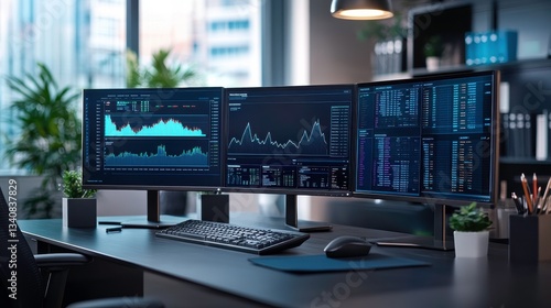 Fototapeta premium A modern workspace featuring multiple screens displaying financial data and charts, emphasizing a tech-savvy environment.