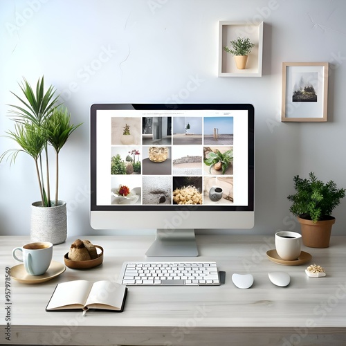 © Ehtisham, Obraz premium A modern workspace with a computer displaying a photo collage. a keyboard. notebook. potted plants and a cup of coffee.