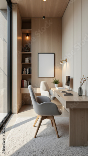 © Tameem, Fototapeta premium A modern workspace with an acoustic panel wall and a desk setup.