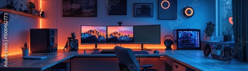 © thanawat, Fototapeta premium A modern workspace with two monitors illuminated by ambient lighting, creating a vibrant and productive environment.