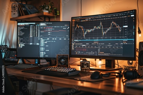 Fototapeta premium A Modern Workstation with a Computer Displaying Stock Market Data