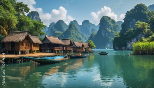 © Eliane, Fototapeta premium A Moment of Peace: Serene Lakeside Huts and Boats Offer a Tranquil Retreat