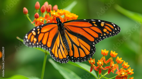 Fototapeta premium A monarch butterfly gracefully alighting on a cluster of milkweed blossoms