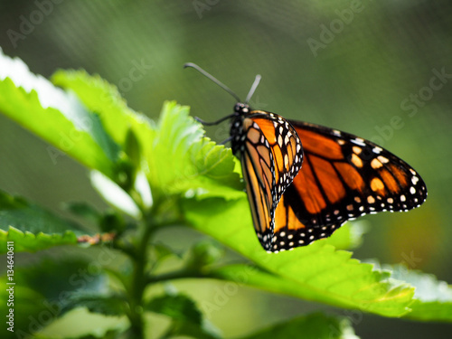 © Nikki, Naklejka premium A monarch butterfly perched on a leaf.