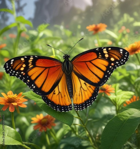 Fototapeta premium a monarch butterfly perched on a leaf in a vibrant meadow, outdoor, green,...