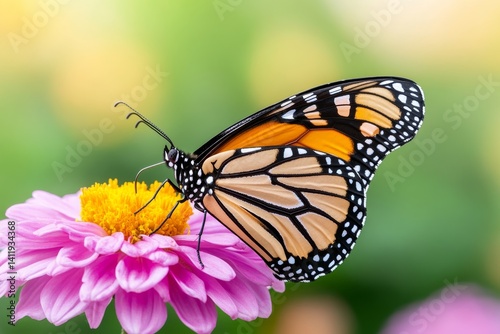Fototapeta premium A monarch butterfly resting on a bright flower, its delicate wings folded...