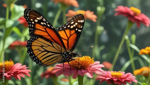 Fototapeta premium A monarch butterfly sips nectar from a vibrant zinnia flower in a lush summer garden, serene, sunny