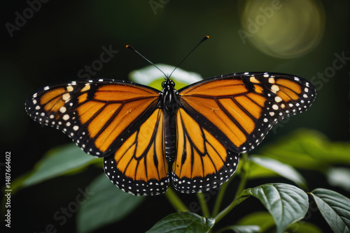 Fototapeta premium A monarch butterfly sits atop a leaf, its vibrant wings unfolded