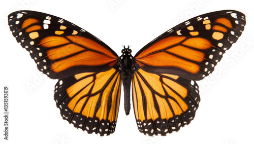 Fototapeta premium A monarch butterfly with spread wings on a white background.