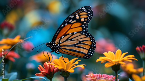 Fototapeta premium A monarch butterfly, with vibrant flowers as the background, during spring...