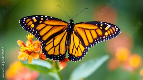 Fototapeta premium A monarch butterfly with vibrant orange and black wings rests gently on a...
