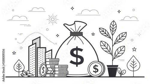 Fototapeta premium A money bag overflowing with financial growth, symbolizing wealth and prosperity amidst a cityscape and thriving plant, depicted in a clean minimalist line art style.