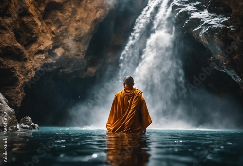 © Wirestock, Obraz premium a monk meditating in the shallow water in front of a waterfall
