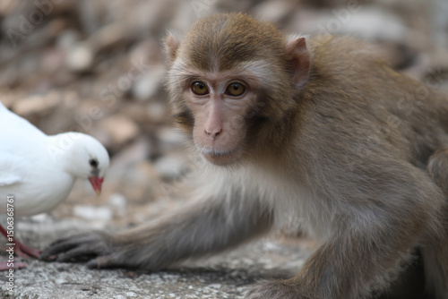 © mizmizstk, Naklejka premium a monkey and a white bird on a rocky ground