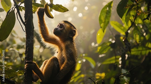 Fototapeta premium A monkey clings to a tree branch amidst a forest with sunlight filtering...