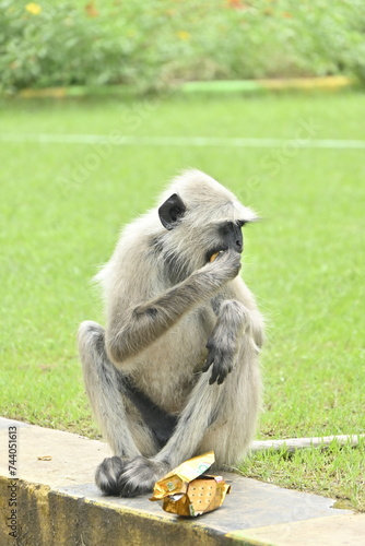 © SN_Creation, Obraz premium A monkey eating a biscuit, a monkey sitting on the ground saying biscuit with a green meadow behind it