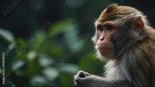 © Oleksandr, Fototapeta premium A monkey peeking from behind a leaf, observing its surroundings with curiosity and caution