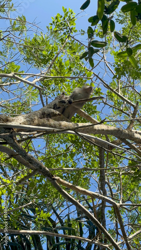 © Syahrul Zidane A, Fototapeta premium A Monkey Perched High in a Lush Tropical Canopy Under a Bright Blue Sky