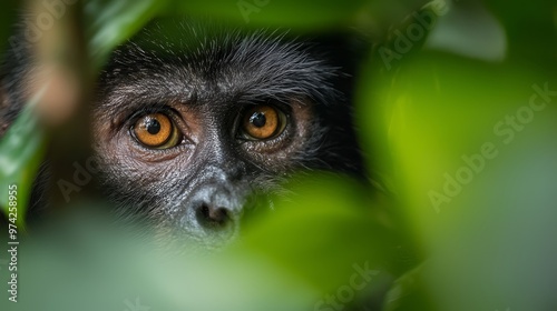 Fototapeta premium A monkey's face, peeking from behind a green leafy branch, contrasts with the...