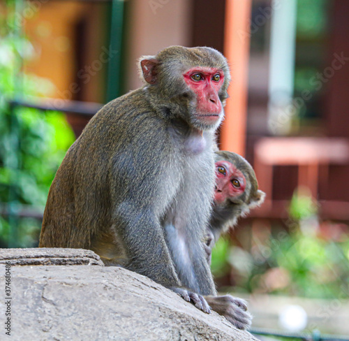 © schankz, Obraz premium A monkey sits on a stone in a park