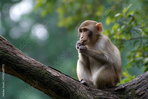 © mizmizstk, Obraz premium a monkey sitting on a tree branch eating something