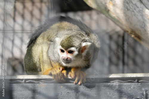 Obraz premium A monkey with dark eyes sits on a tree.