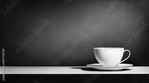 Fototapeta premium A monochromatic image of a coffee mug and plate sitting on a white table against a black backdrop