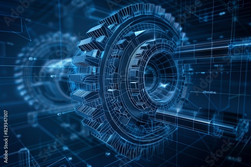 © -DEAR-, Obraz premium A monochromatic wireframe depiction of a gear, set against a dark blue background, symbolizing precision engineering and technical expertise.
