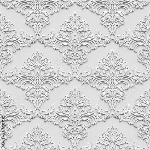 Fototapeta premium A monochrome damask pattern in shades of off-white. The ornate floral motifs appear to be embossed or raised on a clean background, creating a three-dimensional feel. Seamless repeatable texture.