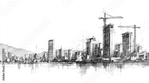 Obraz premium A monochrome sketch of a city skyline featuring tall buildings and cranes,...