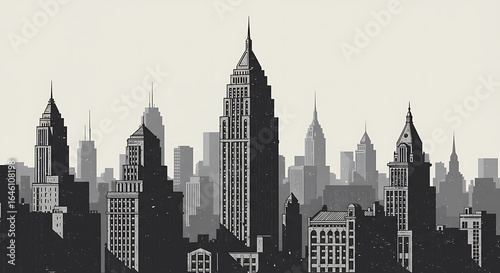 Naklejka premium A monochrome skyline featuring various skyscrapers and buildings, creating a...