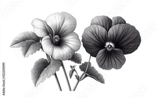 Fototapeta premium A monochrome vector illustration of two violets, one in full bloom and the other in a closed bud form