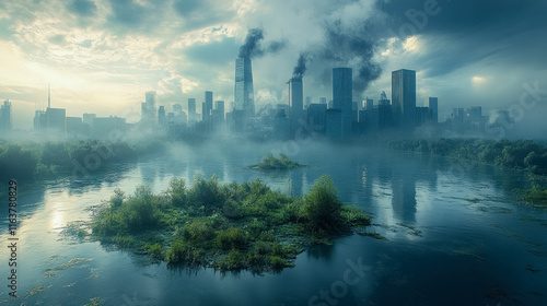 Naklejka premium A moody cityscape with fog, water, and damaged buildings, portraying a sense...