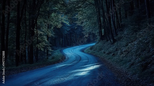 Fototapeta premium A moonlit country road winding through dense woods, with shadows stretching...