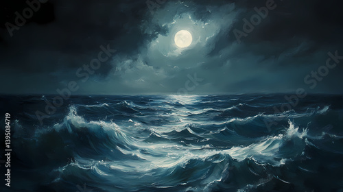 © Thiago, Fototapeta premium A moonlit sea veiled in mist offers a serene and mysterious atmosphere. Veiled Ocean. Illustration