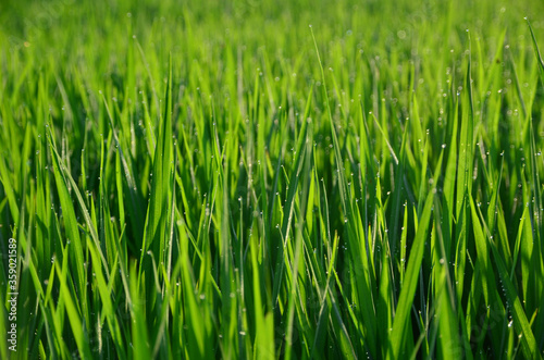 Obraz premium A morning dew drop on paddy leaves at Ubud, Bali, Indonesia.